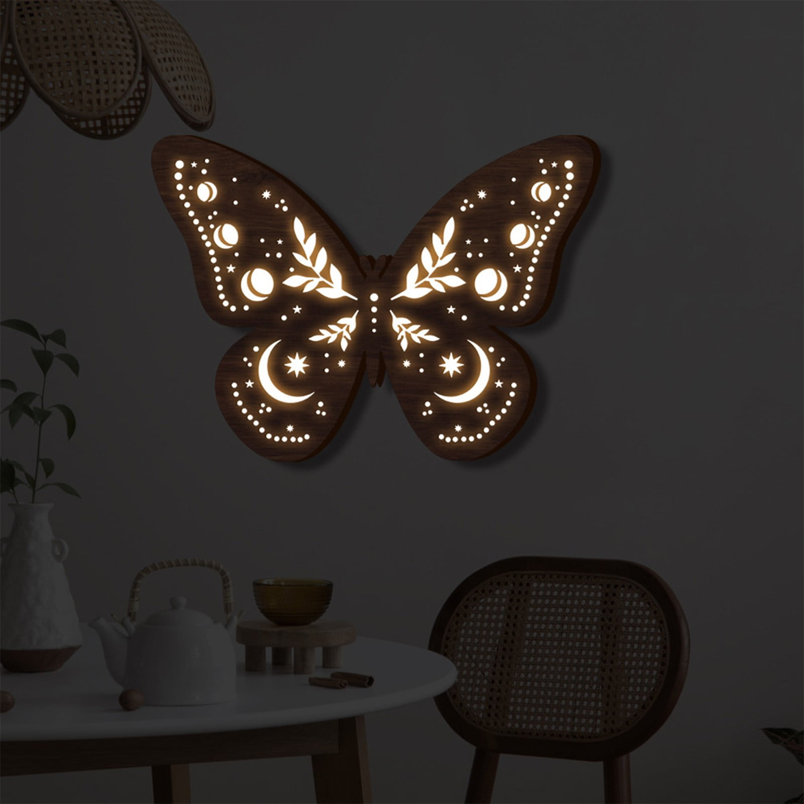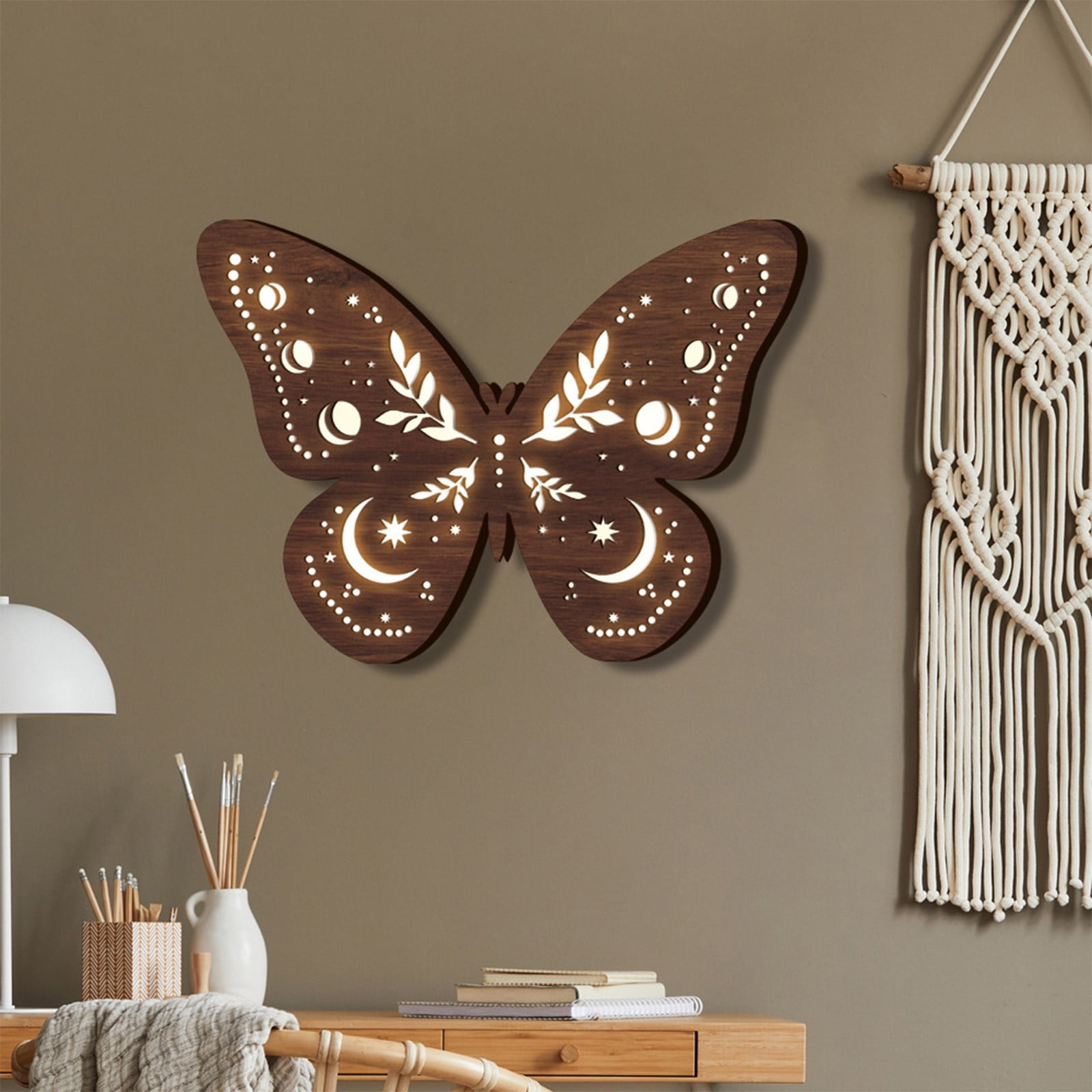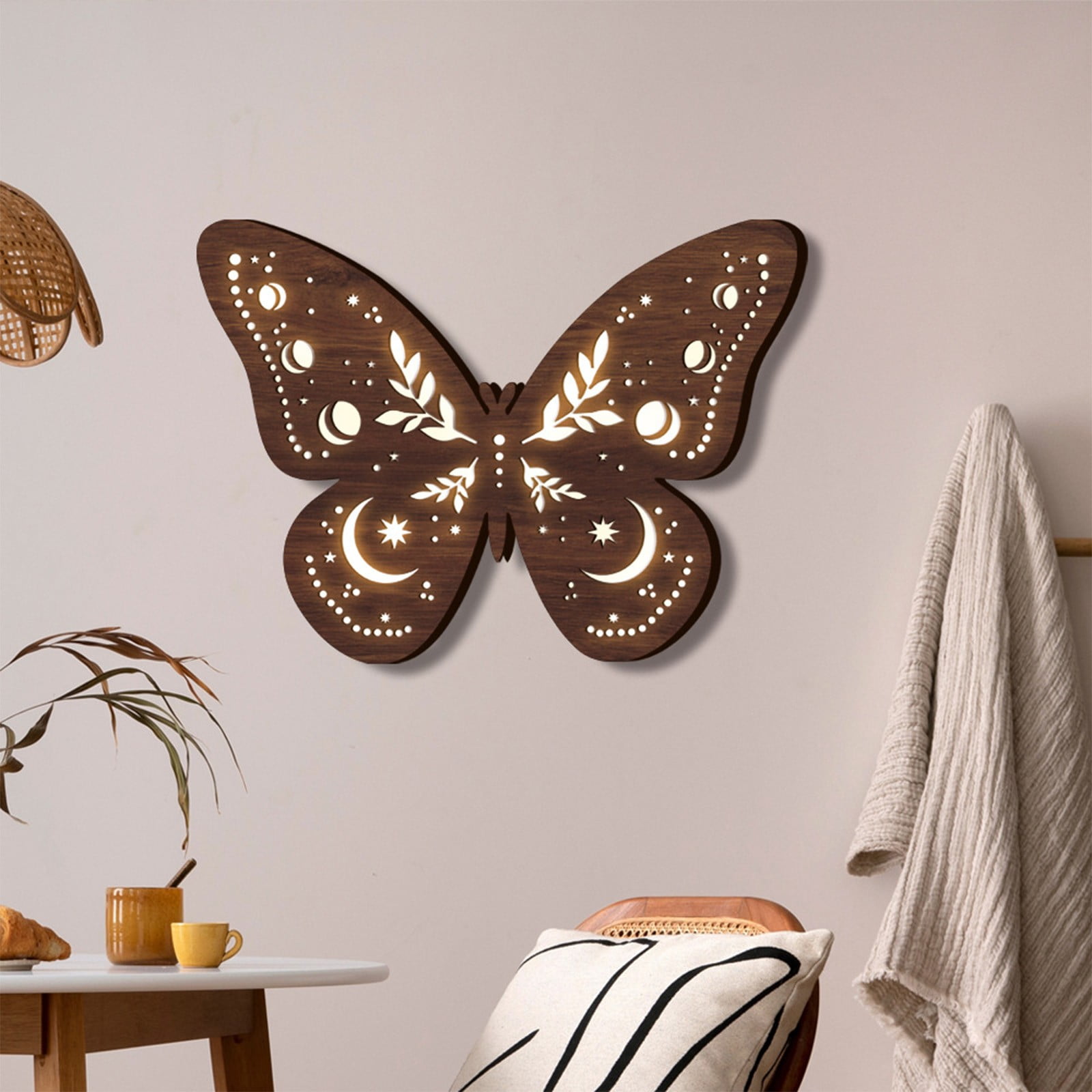 AuroraX Led Wall Lights,Battery Operated Indoor Butterfly Moon Light Night Light Room Hanging Home Wall Decor Birthday Gifts for Teen Girl Boy Product Description: Wall Decoration Pendant Bohemian Wooden LED Night Light Wall Decoration Pendant Features: Product Name: Wooden luminous lamp Color: brown Material: Wooden Battery: Requires 2 No. 5 batteries Packaging